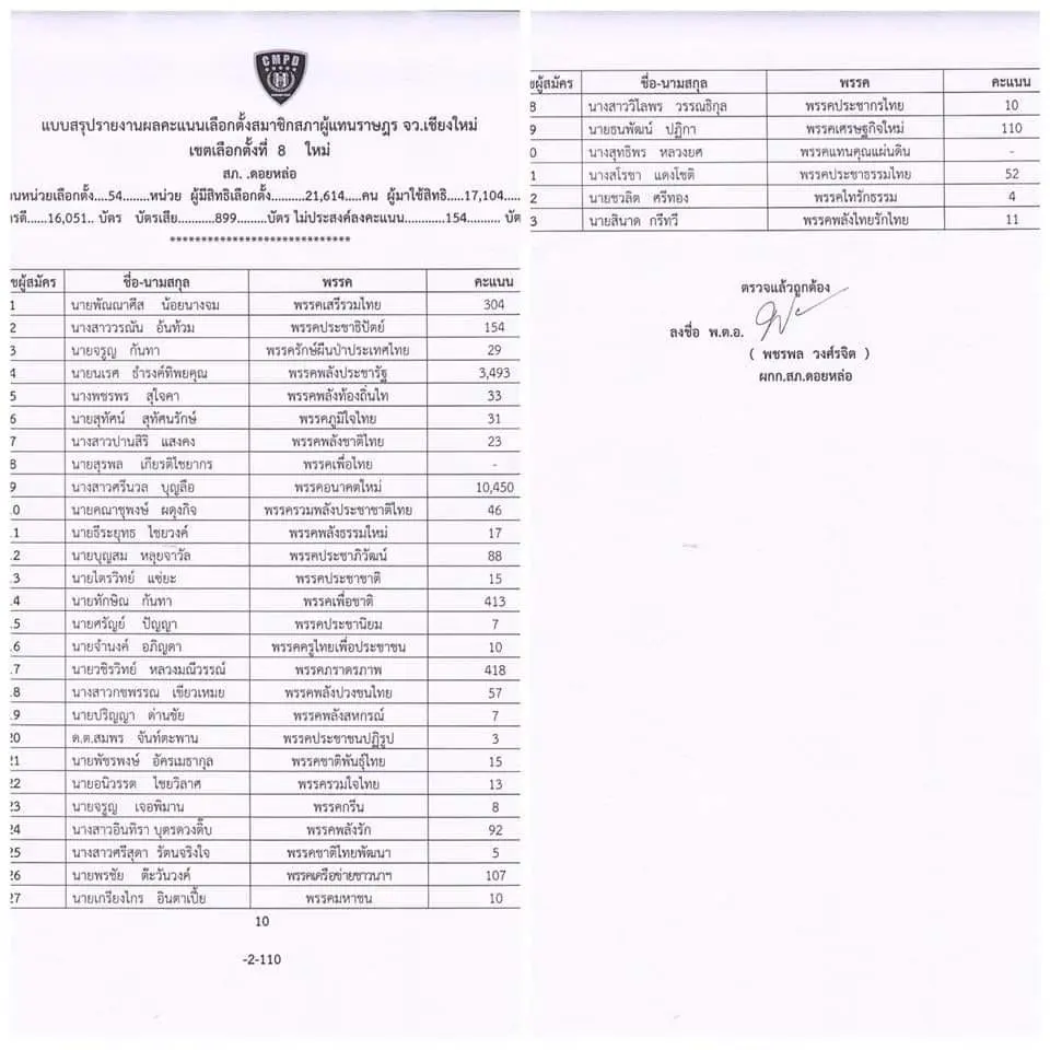 อ.ดอยหล่อ อนาคตใหม่ 10,450 คะแนน / พลังประชารัฐ 3,493 คะแนน (นับคะแนนครบ)
