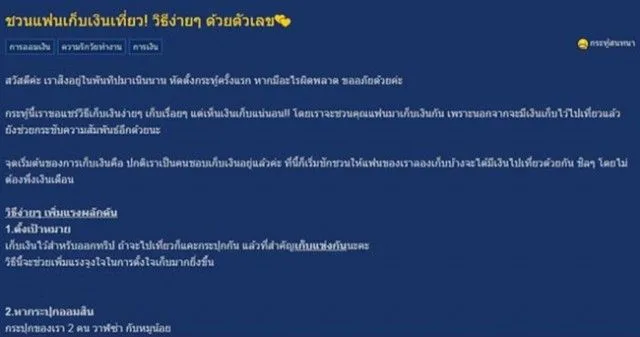 สำหรับไอเดียนี้เกิดขึ้นจากเจ้าของกระทู้ที่เป็นคนชอบออมอยู่แล้ว แต่เธออยากชวนให้คุณแฟนเธอมาออมด้วย โดยการชวนกันเก็บเงินเพื่อไปเที่ยว จะได้มีเงินไปเที่ยวด้วยกันแบบชิลๆ โดยไม่ต้องพึ่งพาเงินเดือน ด้วยวิธีการ ดังนี้