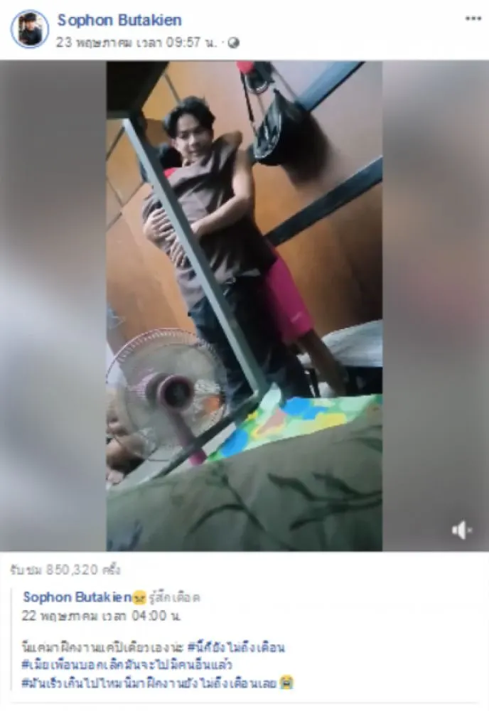 เป็นเรื่องราวที่มีคนแห่แชร์และเข้ามาแสดงความคิดเห็นกันเป็นจำนวนมาก เมื่อผู้ใช้เฟสบุ๊คที่ใช้ชื่อว่า Sophon Butakien ได้โพสต์เรื่องราวของหนุ่มที่โดนแฟนทิ้ง โดยได้ระบุข้อความว่า
