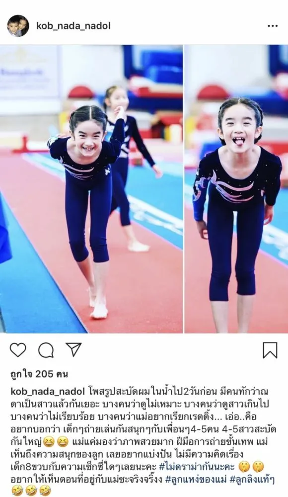 "โพสต์รูปสะบัดผมในน้ำไป 2 วันก่อน มีคนทักว่าณดาเป็นสาวแล้วกันเยอะ บางคนว่าดูไม่เหมาะ บางคนว่าดูสาวเกินไป บางคนว่าไม่เรียบร้อย บางคนว่าแม่อยากเรียกเรตติ้ง... เอ่อ...คือ อยากบอกว่า เด็กๆ ถ่ายเล่นกันสนุกๆ กับเพื่อนๆ 4-5 คน 4-5 สาวสะบัดกันใหญ่ แม่แค่มองว่าภาพสวยมาก ฝีมือการถ่ายขั้นเทพ แม่เห็นถึงความสนุกของลูก เลยอยากแบ่งปัน ไม่มีความคิดเรื่องเด็ก 8 ขวบกับความเซ็กซี่ใดๆ เลยนะคะ