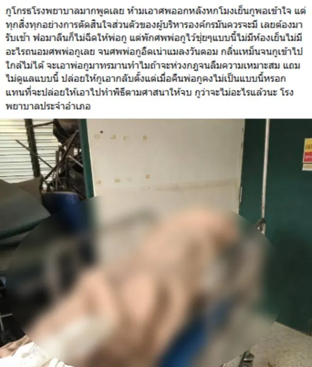 จากกรณีที่ สมาชิกเฟซบุ๊กท่านหนึ่งได้มีการโพสต์ภาพ ร่างของพ่อที่เสียชีวิตอยู่ในโรงพยาบาลแห่งหนึ่ง ใน จ.นครราชสีมา พร้อมกับระบุว่า