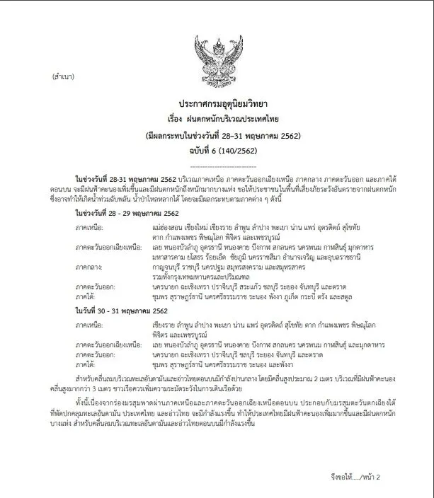 วันที่ 28พ.ค.62 กรมอุตุฯเตือน ในช่วงวันที่ 28-31 พฤษภาคม 2562 บริเวณภาคเหนือ ภาคตะวันออกเฉียงเหนือ ภาคกลาง ภาคตะวันออก และภาคใต้ตอนบน จะมีฝนฟ้าคะนองเพิ่มขึ้นและมีฝนตกหนักถึงหนักมากบางแห่ง ขอให้ประชาชนในพื้นที่เสี่ยงภัยระวังอันตรายจากฝนตกหนัก ซึ่งอาจทำให้เกิดน้ำท่วมฉับพลัน น้ำป่าไหลหลากได้ โดยจะมีผลกระทบตามภาคต่าง ๆ ดังนี้