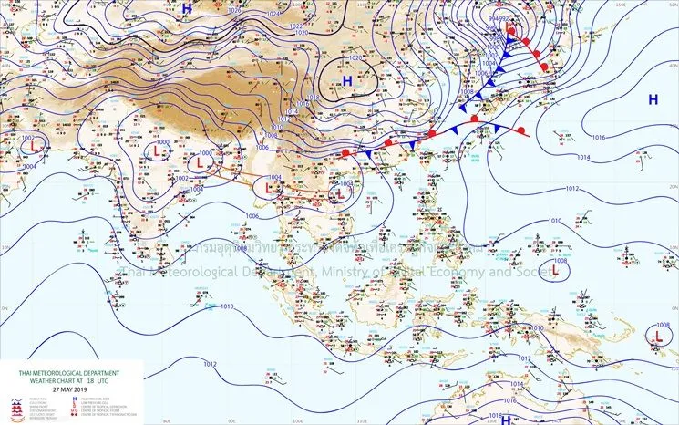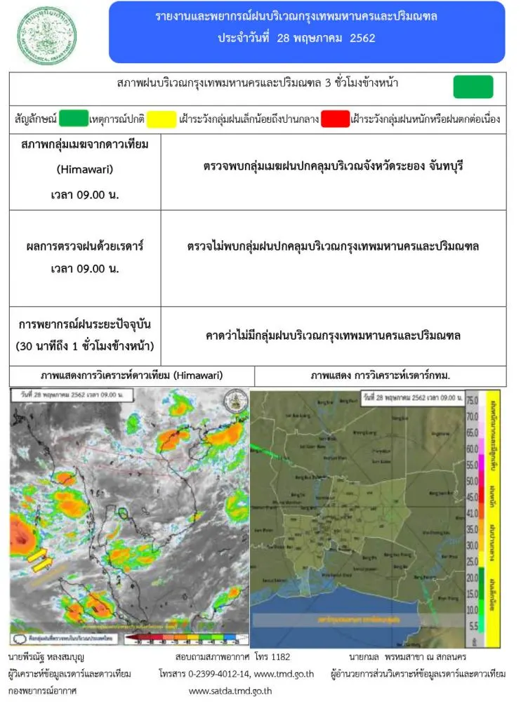 พยากรณ์อากาศ 24 ชั่วโมงข้างหน้า บริเวณภาคเหนือ ภาคตะวันออกเฉียงเหนือ ภาคตะวันออก และภาคใต้ มีฝนฟ้าคะนองเพิ่มมากขึ้นและมีฝนตกหนักบางแห่ง ขอให้ประชาชนในพื้นที่เสี่ยงภัยระวังอันตรายจากฝนตกหนัก ซึ่งอาจทำให้เกิดน้ำท่วมฉับพลัน น้ำป่าไหลหลากได้ สำหรับทะเลอันดามันและอ่าวไทยตอนบน มีคลื่นสูงประมาณ 2 เมตร บริเวณที่มีฝนฟ้าคะนองคลื่นสูง 2-3 เมตร ขอให้ชาวเรือบริเวณดังกล่าวเดินเรือด้วยความระมัดระวัง