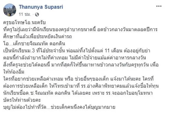 เรื่องราวนี้เป็นอีกหนึ่งเรื่องราว ที่ได้รับรู้ความยากลำบากของเด็กผู้ชายคนหนึ่งที่ยอมอดข้าวกลางวันเพื่อที่จะประหยัดค่ารถ โดยเรื่องราวนี้ถูกเผยแพร่จากเฟซบุ๊กชื่อว่า “Thanunya Supasri” ซึ่งเธอคนนี้เป็นคุณครูสอนนาฏศิลป์ไทย โรงเรียนอ่างศิลาพิทยาคม ได้ออกมาโพสต์เรื่องราวชีวิตของนักเรียนชายรายหนึ่งที่มีชีวิตแสนลำบาก สุดแสนน่าสงสารเป็นอย่างมากโดยครูสาวท่านนี้ได้ระบุข้อความไว้ว่า….