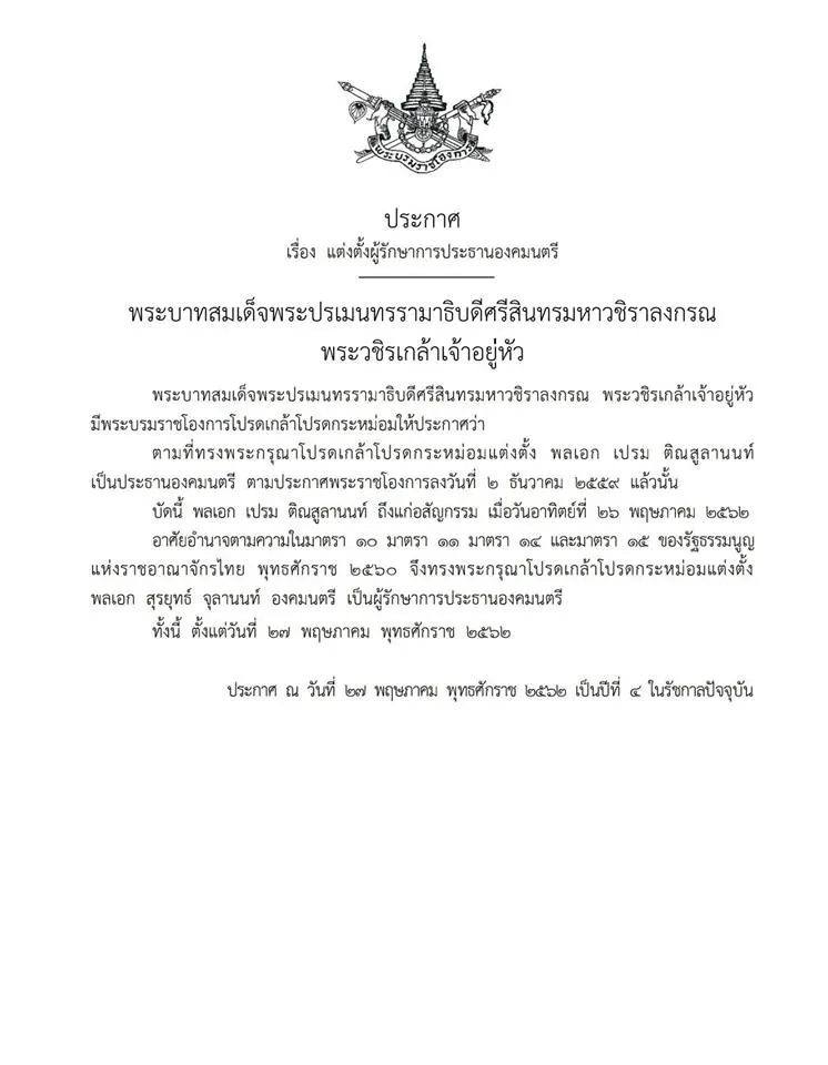 มีพระบรมราชโองการโปรดเกล้าฯ แต่งตั้ง พล.อ.สุรยุทธ์ จุลานนท์ องคมนตรี เป็นผู้รักษาการประธานองคมนตรี