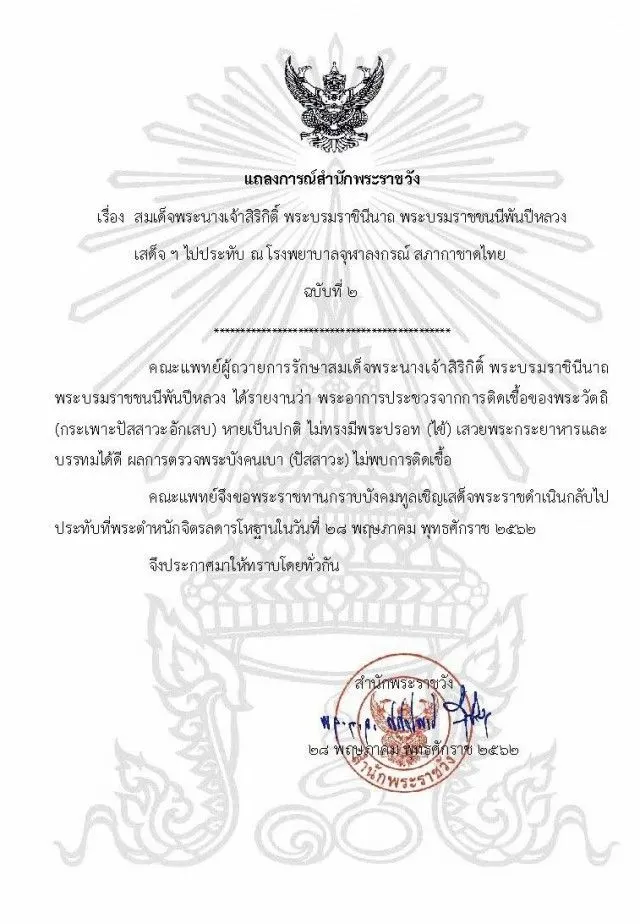 แถลงการณ์สำนักพระราชวัง เรื่อง สมเด็จพระนางเจ้าสิริกิติ์ พระบรมราชินีนาถ พระบรมราชชนนีพันปีหลวง เสด็จฯ ไปประทับ ณ โรงพยาบาลจุฬาลงกรณ์ สภากาชาดไทย ฉบับที่ 2