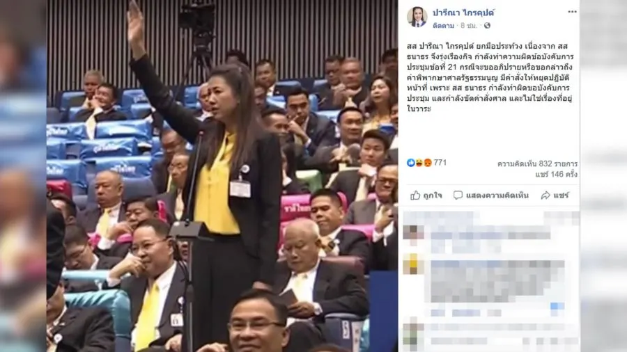 ทั้งนี้ สำหรับประเด็นการท้าทายน.ส.พรรณิการ์ นั้น น.ส.ปารีณา ได้โพสต์เฟซบุ๊กเมื่อวันที่ 26 พ.ค. ระบุว่า ส.ส. ปารีณา ประท้วง ส.ส. หญิง พรรคอนาคตใหม่ ที่ผิดข้อบังคับการประชุม ข้อที่ 22 การจะขออภิปราย ไม่ใช่จะเดินไปกดปุ่มเปิดไมค์แล้วพูดได้ทันที จะต้องยกมือเหนือศรีษะ และให้ประธานอนุญาตเสียก่อน