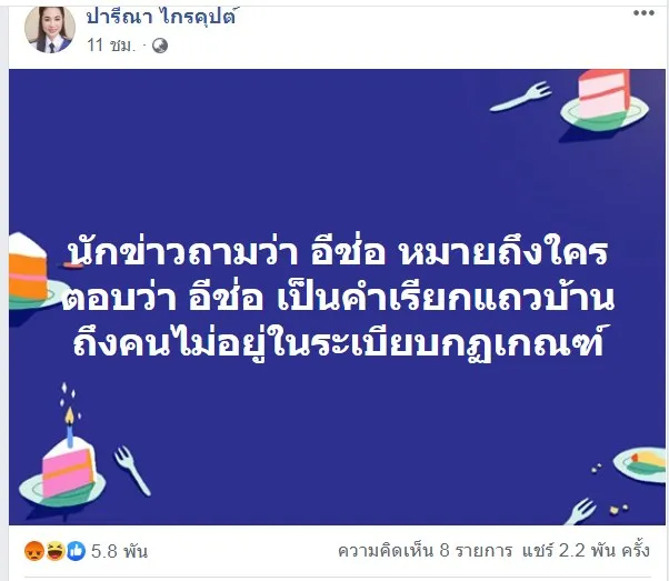 จากกรณี น.ส. ปารีณา ไกรคุปต์ สมาชิกสภาผู้แทนราษฎร (ส.ส.) จ.ราชบุรี พรรคพลังประชารัฐ ไลฟ์สดถึงพรรคสีส้ม ทั้งยังฝากไปถึงคนชื่อช่อ โดยใช้คำว่า อี ท้ามาเจอในไลฟ์สด จะขอสั่งสอนเรื่องมารยาทในการประชุมสภาผู้แทนราษฎร