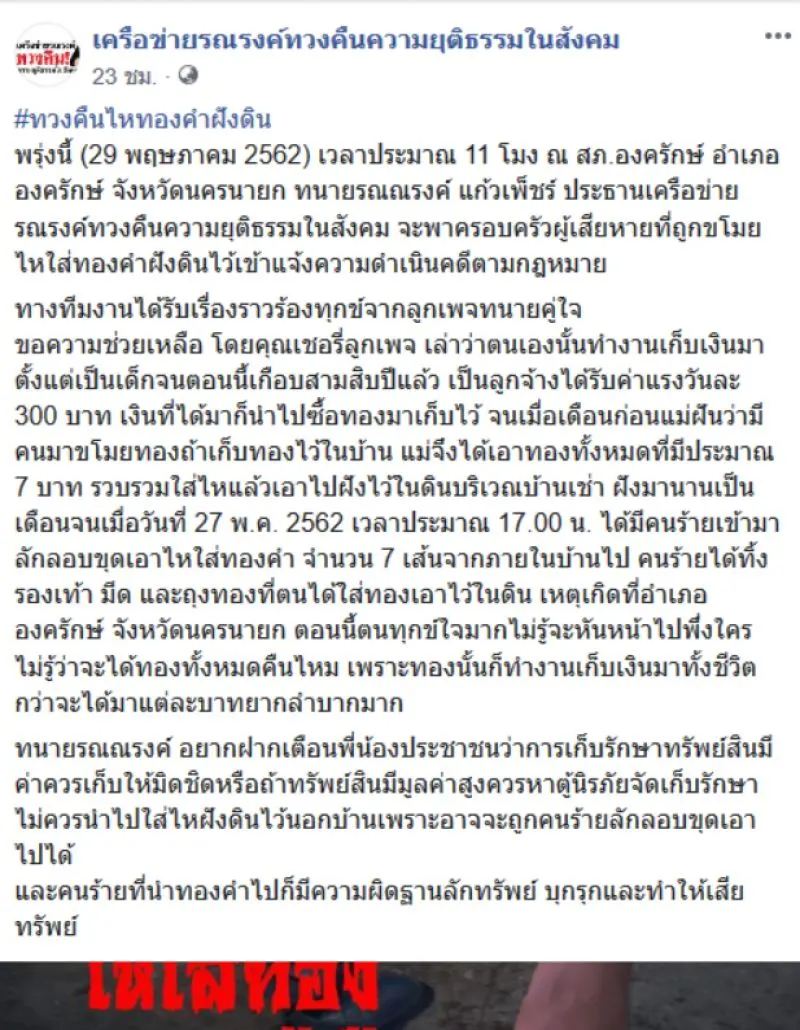 ยุคเศรษฐกิจดีจริงหรือ ที่ขโมยโจรเต็มบ้านเมือง 29 พฤษภาคม 2562 ผู้สื่อข่าวรายงานว่า โลกออนไลน์มีการแชร์เรื่องราวของผู้ใช้เพจเฟซบุ๊กชื่อ เครือข่ายรณรงค์ทวงคืนความยุติธรรมในสังคม ซึ่งระบุข้อความว่า ทวงคืนไหทองคำฝังดิน พรุ่งนี้ (29 พฤษภาคม 2562) เวลาประมาณ 11 โมง ณ สภ.องครักษ์ อำเภอองครักษ์ จังหวัดนครนายก ทนายรณณรงค์ แก้วเพ็ชร์ ประธานเครือข่ายรณรงค์ทวงคืนความยุติธรรมในสังคม จะพาครอบครัวผู้เสียหายที่ถูกขโมยไหใส่ทองคำฝังดินไว้เข้าแจ้งความดำเนินคดีตามกฎหมาย