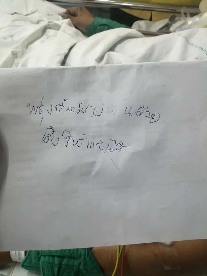 – แกเขียนกว่าจะได้แต่ละคำ”พรุ่งนี้มารับไปบ้านด้วย” ผมบอกว่าเดี๋ยวให้ป้าไปคุยกับหมอให้ว่าพอจะกลับไปอยู่บ้านได้วันไหน ต้องซื้ออะไรไปเตรียมไว้บ้าง แกก็เขียนว่า”ดึงให้ไปจนได้ “ผมถามว่าพยาบาลตบแรงมั้ย แกพยักหน้า ถามอีกว่าแรงมากมั้ย เพราะผมยังมองในแง่ดีว่าเค้าอาจจะแค่ตบๆเรียกปลุกอะไรประมาณนี้ แกพยักหน้าตอบว่าแรงมาก