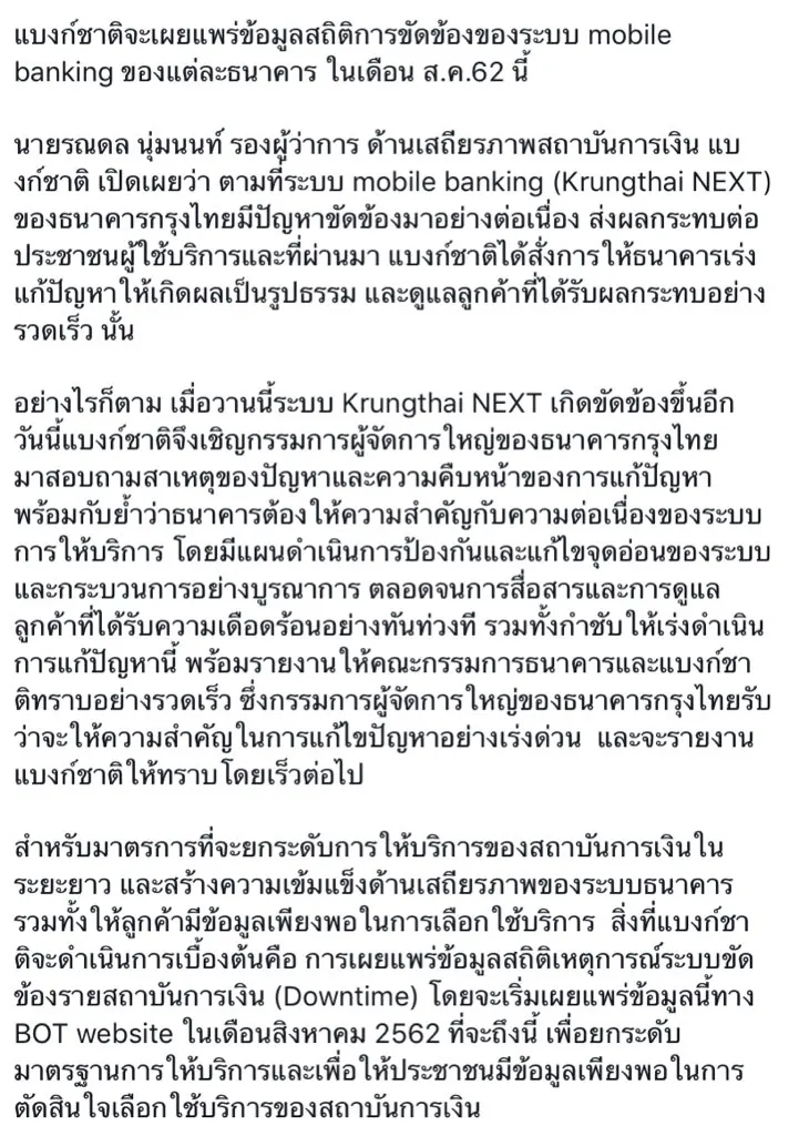BOT ประกาศเปิดรายงานแบงค์ล่มรายธนาคาร เริ่มเดือนสิงหาคมนี้, KTB ตอบรับจะแก้ปัญหาโดยเร็ว