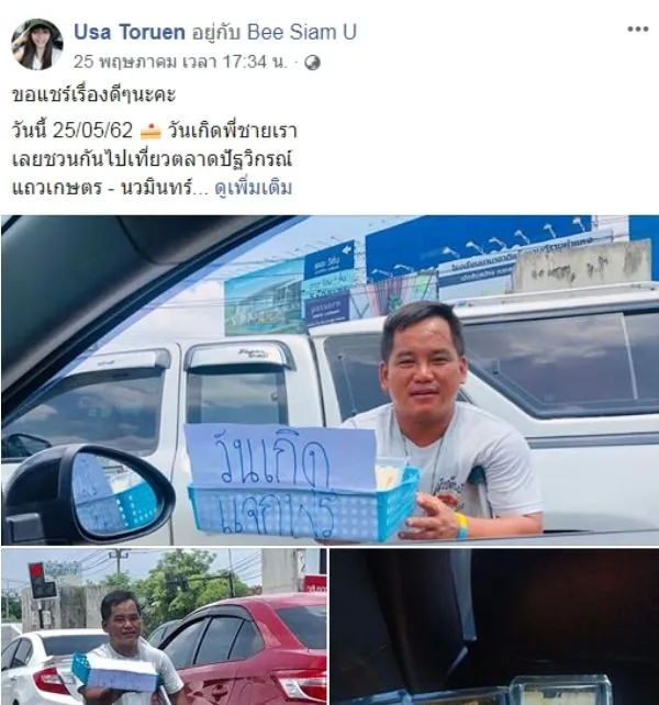 ส่วนตัวเราก็ขออวยพรผ่าน Facebook นี้ ขอให้พี่เค้ามีแต่ความสุข สุขที่ได้รับรอยยิ้มของผู้อื่นขอให้พี่มีแต่ความเจริญ สุขภาพแข็งแรง ตลอดไป ปล.เราไม่ได้วิ่งเส้นนั้น (แค่วันนี้ไปเที่ยว) ถ้าใครใช้เส้นทางผ่านแยกนวลจันทร์ ฝากช่วยอุดหนุนพี่เค้าด้วยนะคะ หรือช่วยแชร์ก็ได้ #ขอบคุณค่ะ