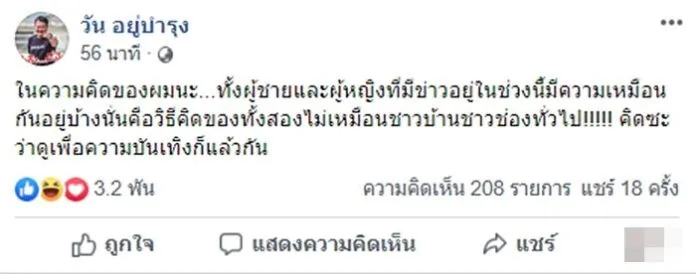 โพสแรง วัน อยู่บำรุง เผยชาย หญิงที่เป็นข่าวตอนนี้ สมองไม่เหมือนคนทั่วไป ชี้ดูเพื่อความบันเทิง