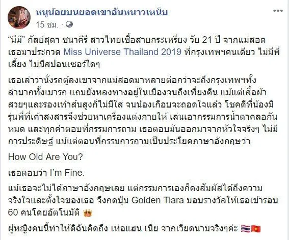นับถือใจเธอเลยจริงๆกับ “มีมี” กัลย์สุดา ชนาคีรี สาวไทยเชื้อสายกระเหรี่ยง วัย 21 ปี จากแม่สอด เธอมาประกวด Miss Universe Thailand 2019 ที่กรุงเทพฯ เดินทางมาประกวดคนเดียวไม่มีแม้แต่พี่เลี้ยงและสปอนเซอร์ นับว่าเธอมีความมุ่งมั่นมาก