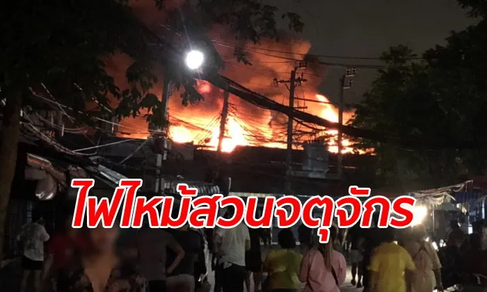เจ้าหน้าที่สถานีดับเพลิง และกู้ภัยสุทธิสารประจำจุดรักษาการตลาดนัดสวนจตุจักร อยู่ระหว่างการใช้น้ำระงับเหตุเพลิงไหม้