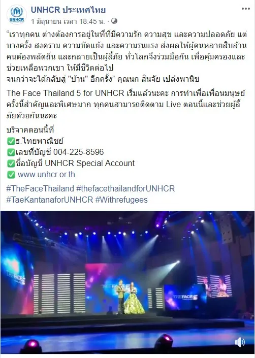 2- UNHCR ประเทศไทย เลือก ‘นก - สินจัย เปล่งพานิช’ ขึ้นพูดเรื่องผู้ลี้ภัย และเปิดตัวในรายการ The Face Thailand 5 รอบ Final Walk
