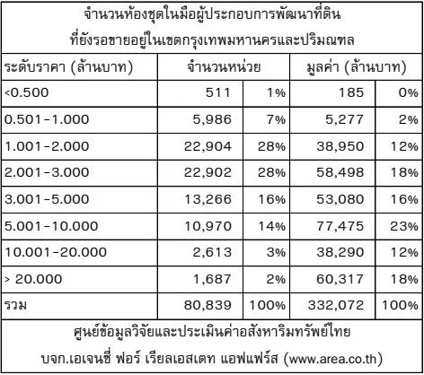 ตามที่มีการประมาณการจำนวนห้องชุดรอขายนั้น ที่ผ่านมาตัวเลขไม่ครบถ้วน มาดูตัวเลขที่ครบถ้วนจากศูนย์ข้อมูลวิจัยและประเมินค่าอสังหาริมทรัพย์ไทย ว่าในเขตกรุงเทพมหานครและปริมณฑล มีห้องชุดรอขายอยู่ 80,839 หน่วย รวมมูลค่าสูงถึง 332,072 ล้านบาท