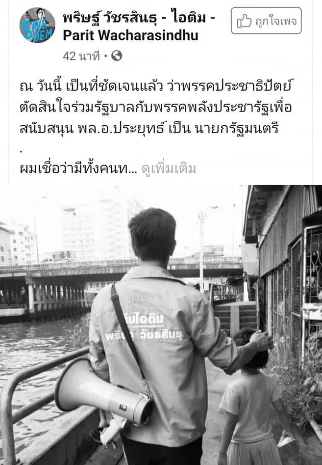โดยไอติม ระบุว่า ณ วันนี้ เป็นที่ชัดเจนแล้ว ว่าพรรคประชาธิปัตย์ตัดสินใจร่วมรัฐบาลกับพรรคพลังประชารัฐเพื่อสนับสนุน พล.อ.ประยุทธ์ เป็น นายกรัฐมนตรี