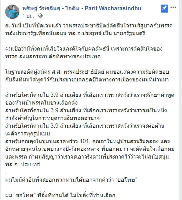 อนาคตผมจะเป็นอย่างไร ไม่ใช่เรื่องสำคัญในวันนี้ แต่ผมยังขอยืนยันว่าความมุ่งมั่นที่อยากจะเข้ามาเปลี่ยนแปลงประเทศไปในทิศทางที่ดีขึ้นและซื่อตรงต่อความต้องการของประชาชน เป็นความตั้งใจที่จะไม่มีวันจางหายด้วยความเคารพ พริษฐ์ วัชรสินธุกล่าว