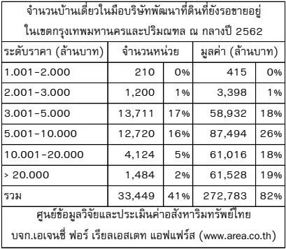 ดร.โสภณ พรโชคชัย ประธาน ศูนย์ข้อมูลวิจัยและประเมินค่าอสังหาริมทรัพย์ไทย บจก. เอเจนซี่ ฟอร์ เรียลเอสเตท แอฟแฟร์ส (www.area.co.th) ระบุว่าจากการประมาณการถึงล่าสุดกลางปี 2562 พบว่า ยังมีบ้านเดี่ยวรอการขายอยู่ทั้งหมด 33,449 หน่วยในเขตกรุงเทพมหานครและปริมณฑลที่รอเข้าไปขายในครึ่งหลังของปี 2562 ในจำนวนนี้รวมมูลค่าสูงถึง 272,763 ล้านบาท หรือประมาณ 8% ของงบประมาณแผ่นดินไทยทั้งประเทศ