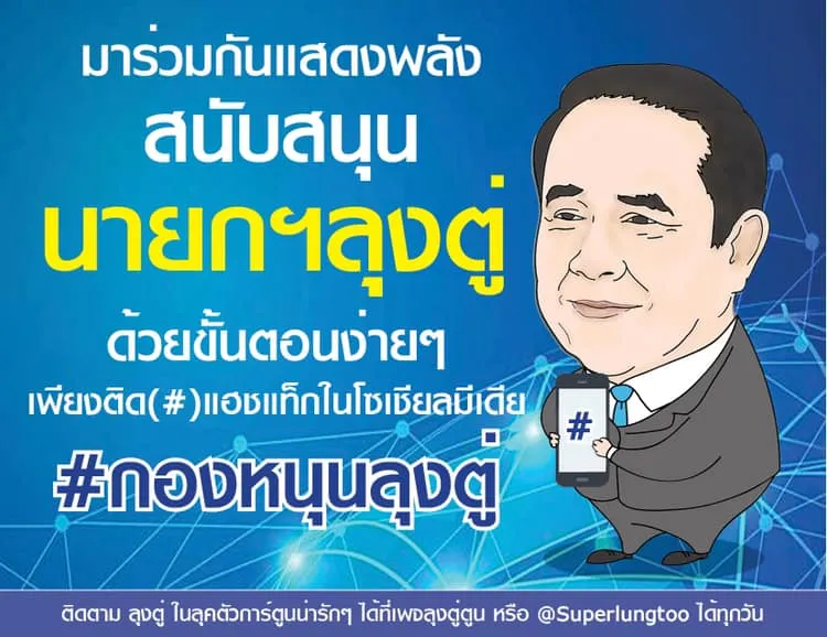 5 มิ.ย. 2562 เพจ "ลุงตู่ตูน" โพสต์ชวนชาวเน็นมาร่วมพลังสนับสนุน พล.อ.ประยุทธ์ จันโอชา เป็นนายกรัฐมนตรี อีกสมัย โดยชวนแฟนคลับชาวโซเชียลให้ติดแฮชแท็กลง #กองหนุนลุงตู่...พร้อมรูปภาพการ์ตูน "ลุงตู่ " พร้อมระบุว่า มาร่วมกันแสดงพลังสนับสนุน นายกฯลุงตู่ ด้วยขั้นตอนง่ายๆ เพียงติด(#)แฮชแท็กในโซเชียลมีเดีย #กองหนุนลุงตู่