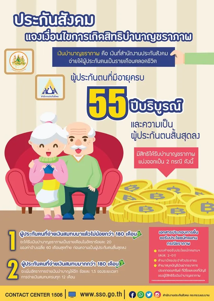 นายอนันต์ชัย อุทัยพัฒนาชีพ เลขาธิการสำนักงานประกันสังคม กระทรวงแรงงาน เปิดเผยว่า สำนักงานประกันสังคมได้จ่ายบำนาญชราภาพให้กับผู้ประกันตน โดยมีเงื่อนไขการเกิดสิทธิผู้ประกันตนจะต้องจ่ายเงินสมทบครบ 180 เดือน มีอายุครบ 55 ปีบริบูรณ์ และความเป็นผู้ประกันตนสิ้นสุดลง หรือในกรณีผู้ประกันตนมีอายุไม่ครบ 55 ปีบริบูรณ์ จะมีสิทธิได้รับเงินบำเหน็จชราภาพ ต่อเมื่อมีคำวินิจฉัยให้เป็นผู้ทุพพลภาพ หรือถึงแก่ความตายก่อนอายุครบ 55 ปีบริบูรณ์