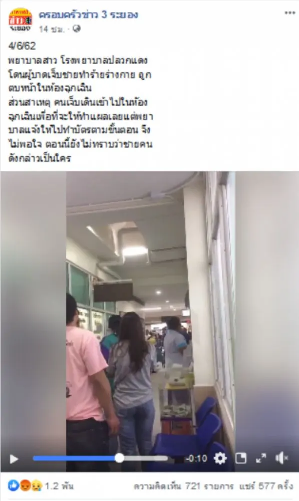 4 มิถุนายน 2562 เพจเฟสบุ๊คที่ใช้ชื่อว่า ครอบครัวข่าว 3 ระยอง ได้เผยคลิปวีดีโอภาพเหตุการณ์ความชุลมุนวุ่นวาย ที่เกิดขึ้นภายในโรงพยาบาลแห่งหนึ่ง ในอำเภอปลวกแดง จังหวัดระยอง ที่เกิดการถกเถียงกันขึ้นระหว่างพยาบาลสาว และคนไข้ พร้อมข้อความระบุว่า…