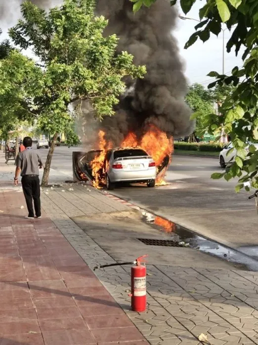 จากนั้นจึงเกิดประกายไฟและเพลิงไหม้อย่างรวดเร็ว สำหรับรถยนต์คันนี้ใช้ระบบน้ำมันเชื้อเพลิง ไม่ได้ติดตั้งระบบแก๊สแต่อย่างใด เพราะตนกลัวซึ่งรถคันนี้ใช้มานานหลายปี ไม่เคยมีปัญหาอะไรเพราะตรวจเช็คสภาพรถอยู่ตลอด