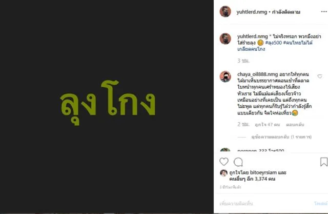 ล่าสุดด้านผู้กำกับชื่อดังอย่าง ยุทธเลิศ สิปปภาค ก็ได้ออกมาเคลื่อนไหวผ่านไอจีส่วนตัว โดยได้โพสต์ภาพข้อความพร้อมได้ระบุข้อความว่า… ม่จริงหรอก พวกมึงอย่าใส่ร้ายลุง ลุง500 คนไทยไม่ได้เกลียดคนโกง หลังภาพดังกล่าวถูกเผยแพร่ออกไปมีชาวเน็ตเข้ามาแสดงความคิดเห็นกันเป็นจำนวนมาก