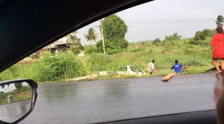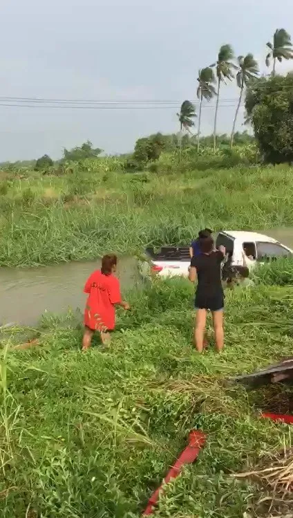 เหตุการณ์ระทึก! ฝนตกถนนลื่นทำรถกระบะเสียหลักพุ่งตกลงคลอง สาวพลเมืองดีผ่านมาพอดีรีบจอดรถ “หยิบค้อน” พุ่งตรงเข้าช่วยเหลือ “ทุบกระจก” นำตัวผู้โดยสารรถพ่อลูกออกมาจากรถกระบะได้อย่างปลอดภัย