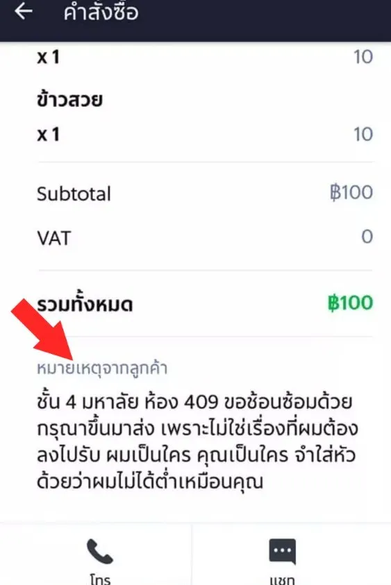 พร้อมกับโพสต์ ภาพหมายเหตุจากลูกค้า ที่ได้ระบุว่า "ชั้น 4 มหาลัย ห้อง 409 ขอช้อนส้อมด้วย กรุณาขึ้นมาส่ง เพราะไม่ใช่เรื่องที่ผมต้องลงไปรับ ผมเป็นใคร คุณเป็นใคร จำใส่หัวด้วยว่าผมไม่ได้ต่ำเหมือนคุณ"