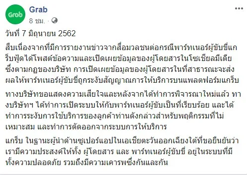 สืบเนื่องจาก ที่มีการรายงานข่าวจากสื่อมวลชนต่อกรณีพาร์ทเนอร์ผู้ขับขี่แกร็บฟู้ดได้โพสต์ข้อความในโซเชียลมีเดียในวันที่ 5 มิถุนายนที่ผ่านมา แกร็บ ประเทศไทย ได้ทราบถึงเหตุการณ์ดังกล่าวพร้อมทั้งติดต่อพาร์ทเนอร์ผู้ขับขี่เพื่อสอบถามถึงรายละเอียดแล้ว โดยพาร์ทเนอร์ผู้ขับขี่แกร็บฟู้ดท่านนี้ยังคงให้บริการบนระบบของเราตามปกติ