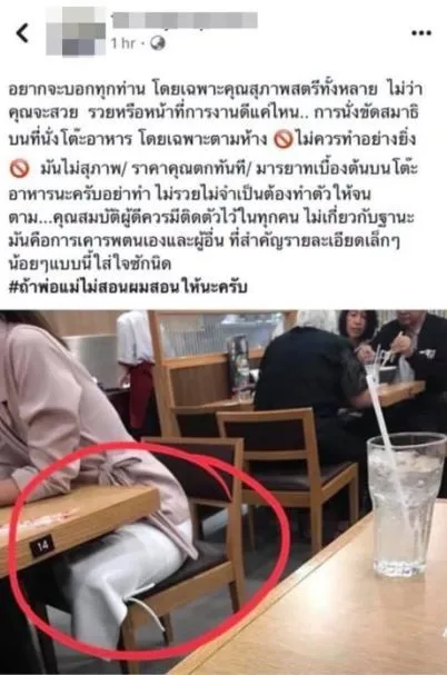 กลายเป็นประเด็นดราม่า ถูกพูดถึง และได้รับการเผยแพร่อย่างกว้างขวาง เมื่อวันที่ 6 มิ.ย. สำหรับกรณีที่มีผู้ใช้เฟซบุ๊กรายหนึ่ง ได้โพสต์ภาพผู้หญิงคนหนึ่งในร้านอาหารญี่ปุ่น ในอิริยาบถนั่งท่าขัดสมาธิบนโต๊ะอาหาร พร้อมระบุข้อความว่า