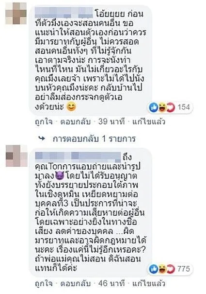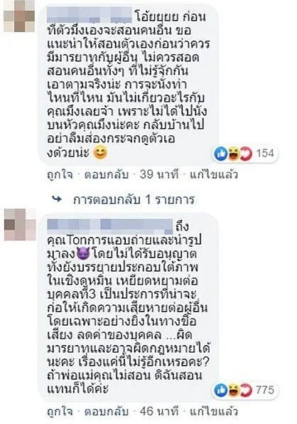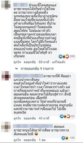 หรือแม้แต่ที่แซะผู้โพสต์กลับว่า น่าจะเรียนมาแต่มารยาทบนโต๊ะอาหาร แต่ไม่เคยเรียนมารยาททางสังคม
