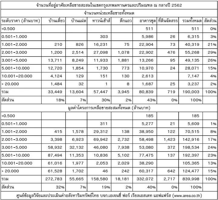 ดร.โสภณ พรโชคชัย ประธานศูนย์ข้อมูลวิจัยและประเมินค่าอสังหาริมทรัพย์ไทย บจก.เอเจนซี่ ฟอร์ เรียลเอสเตท แอฟแฟร์ส (www.area.co.th) ได้สำรวจตลาดที่อยู่อาศัยในเขตกรุงเทพมหานครและปริมณฑลมาอย่างต่อเนื่องและประมาณการว่า ณ กลางปี 2562 จำนวนที่อยู่อาศัยที่ยังรอผู้มาซื้ออยู่มีทั้งหมด 190,003 หน่วย รวมมูลค่า 839,998 ล้านบาท หรือเฉลี่ยหน่วยละ 4.421 ล้านบาท ที่อยู่อาศัยเหล่านี้ไม่ได้ขายไม่ออก แต่ ณ วันที่สำรวจยังไม่ได้ขาย อาจเพราะยังเพิ่งเปิดตัวไม่นานส่วนหนึ่ง ไม่ใช่เพราะมีตำหนิขายไม่ออก ไม่ใช่หาคนซื้อไม่ได้แต่อย่างใด