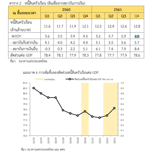 เมื่อวันที่ 6 มิ.ย. นายทศพร ศิริสัมพันธ์ เลขาธิการสำนักงานสภาพัฒนาการเศรษฐกิจและสังคมแห่งชาติ (สศช.) หรือ สภาพัฒน์ แถลงรายงานภาวะสังคมไทยไตรมาส 1/2562 ว่า ไตรมาส 4 ปี 2561 หนี้สินครัวเรือนไทยเท่ากับ 12.8 ล้านล้านบาท เพิ่มขึ้น 6% เมื่อเทียบกับช่วงเดียวกันของปีก่อน และคิดเป็นสัดส่วน 78.6% ต่อ GDP ขณะที่หนี้สินครัวเรือนดังกล่าวเป็นการเพิ่มขึ้นต่อเนื่องเป็นไตรมาสที่ 2 ติดต่อกัน