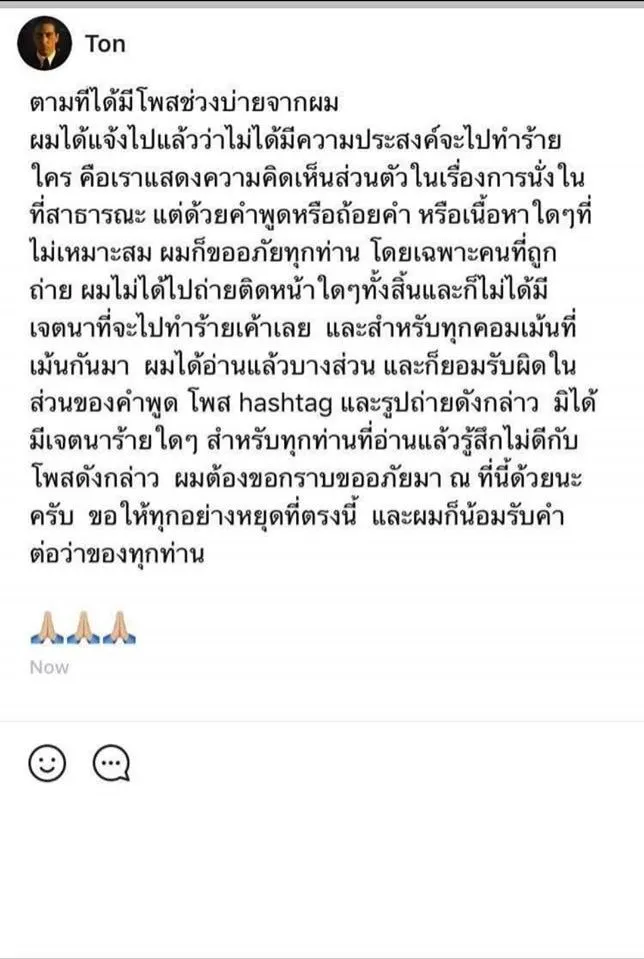 "ผมเป็นเจ้าของโพสต์ดังกล่าวที่เป็นกระแสอย่างมากในโซเชียล ณ ตอนนี้ ก่อนอื่นผมต้องขอกราบขอโทษทุกท่านที่เข้ามาเห็น และรู้สึกไม่ดีกับโพสต์เหล่านี้ ผมต้องกราบขอโทษน้องผู้หญิงที่อยู่ในภาพ ถึงแม้จะไม่ได้เห็นหน้าเห็นตากันก็จริง สิ่งที่ผมพูดไป ไม่ได้มีเจตนาที่จะทำร้ายใครจริงๆ แค่แสดงความเห็นส่วนตัวออกไป ซึ่งแน่นอนว่าอาจจะไม่ถูกต้อง
