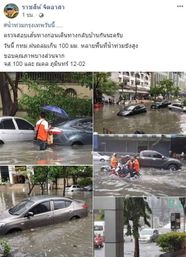 เรียกได้ว่าทำเอาชาว กทม. แตกตื่นกันยกใหญ่ เมื่อมีผู้ใช้เฟสบุ๊คชื่อ ราชสีห์ จิตอาสา ได้ออกมาโพสต์ภาพน้ำท่วมพร้อมทั้งระบุข้อความว่า... น้ำท่วมกรุงเทพวันนี้ ตรวจสอบเส้นทางก่อนเดินทางกลับบ้านกันนะครับ วันนี้ กทม.ฝนถล่มเกิน 100 มม. หลายพื้นที่น้ำท่วมขังสูง