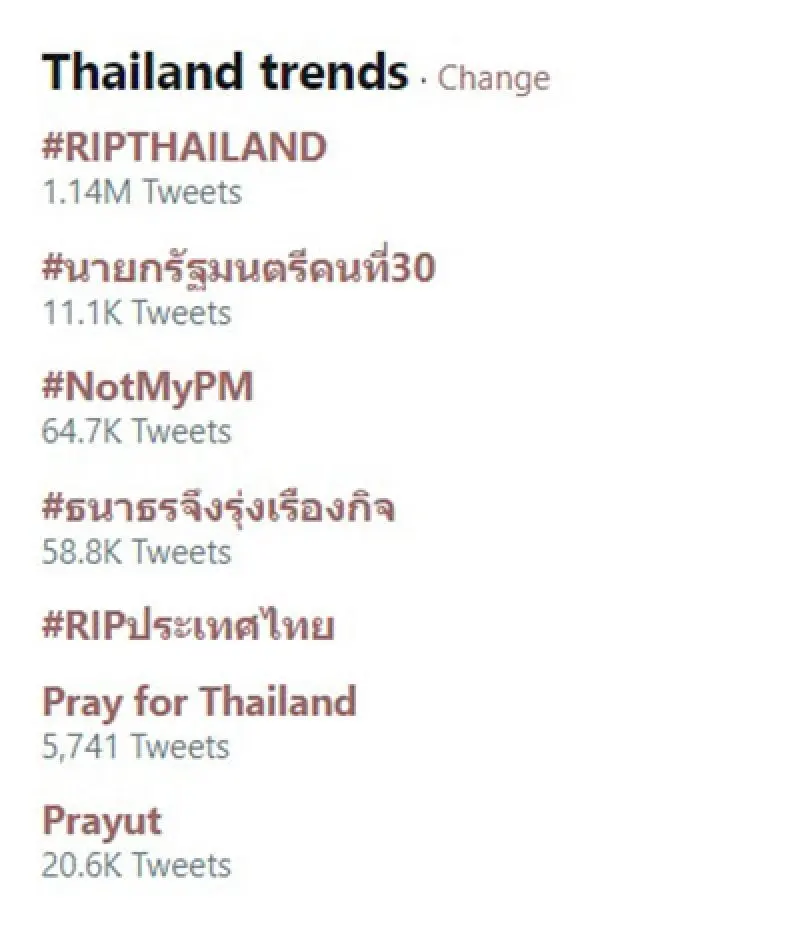 จากกรณีได้มติในที่ประชุมร่วมรัฐสภา ลงคะแนนโหวตให้ความเห็นชอบ พล.อ.ประยุทธ์ จันทร์โอชา ได้เป็นนายกรัฐมนตรีต่อไป ด้วย 500 คะแนนเสียง เอาชนะคู่แข่ง นายธนาธร จึงรุ่งเรืองกิจ หัวหน้าพรรคอนาคตใหม่ ที่ได้ไป 244 คะแนนเสียงนั้น ทำให้เกิดกระแสวิพากษ์วิจารณ์และแสดงความคิดเห็นไปต่างๆ นานาถึงการโหวตนายกรัฐมนตรีของไทยในครั้งนี้ โดยเฉพาะโลกโซเชียลมีเดียยังคงเคลื่อนไหวติดแฮชแท็ก #RIPTHAILAND ติดเทรนด์ในหมู่ผู้ใช้ทวิตเตอร์