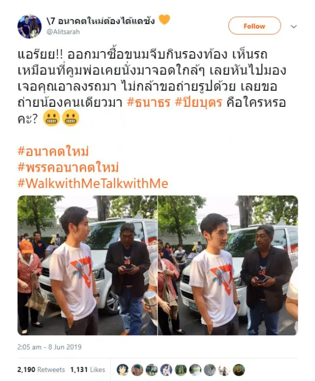 โดยได้ระบุข้อความไว้ว่า แอร๊ยย!! ออกมาซื้อขนมจีบกินรองท้อง เห็นรถเหมือนที่คูมพ่อเคยนั่งมาจอดใกล้ๆ เลยหันไปมอง เจอคุณอาลงรถมา ไม่กล้าขอถ่ายรูปด้วย เลยขอถ่ายน้องคนเดียวมา #ธนาธร #ปิยบุตร คือใครหรอคะ? #อนาคตใหม่ #พรรคอนาคตใหม่ #WalkwithMeTalkwithMe