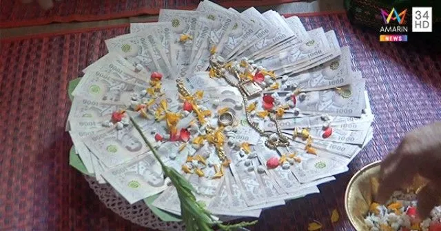 ส่วนค่าสินสอด เป็นเงินสดจำนวน 100,000 บาท และทองรูปพรรณหนัก 3 บาท โดยบรรยากาศภายในงานพิธีเป็นไปอย่างอบอุ่นตามประเพณีไทย ช่วงที่มีพิธีรับไหว้เจ้าบ่าวและเจ้าสาว เพื่อนของคู่บ่าวสาวซึ่งมีอายุตั้งแต่ 60 ขึ้นไป บางคนหลังรับไหว้เสร็จก็ต้องให้คนช่วยพยุงลุกขึ้น เพราะลุกขึ้นเองไม่ไหว สร้างรอยยิ้มให้กับคู่บ่าวสาว และแขกที่มาร่วมพิธีอย่างมาก