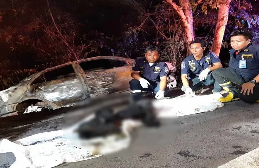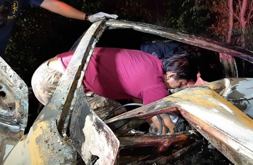 จากนั้นได้เข้าตรวจสอบ พบเป็นรถเก๋งสีบรอนเงิน ถูกไฟเผาไหม้ทั้งคัน ภายในรถพบร่างผู้ขับขี่ นอนล้มไปทางด้านเบาะนั่งด้านซ้ายเสียชีวิต ถูกไฟเผาไหม้ ไม่ทราบว่า เป็นใคร แต่คาดว่า เป็นหญิง เนื่องจากรูปร่างเล็ก ภายในรถไม่พบหลักฐานใดๆ เนื่องจากถูกไฟเผาไหม้จนหมด