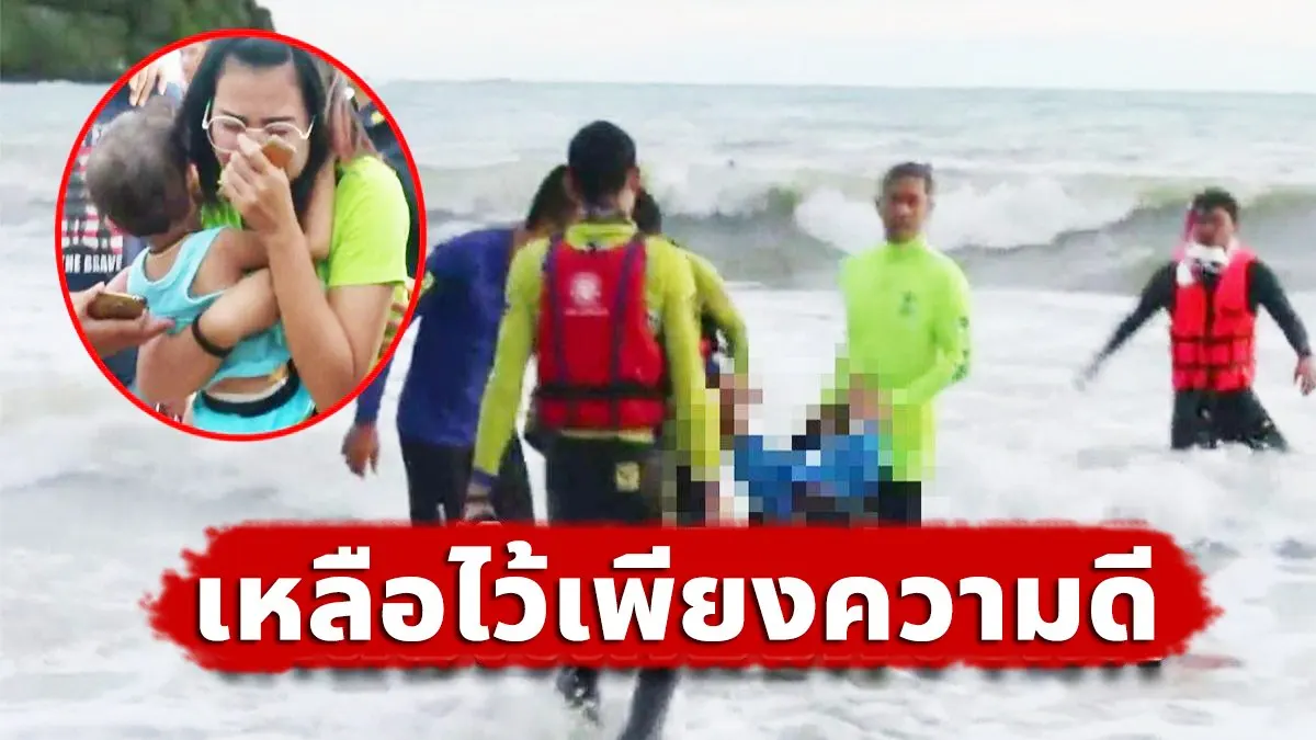 อุ้มลูกร่ำไห้ สามีฝ่าคลื่นช่วย 2 เด็ก ชาย-หญิงสำเร็จ แต่กลับถูกคลื่นซัดจมทะเล ต่อหน้าต่อตา