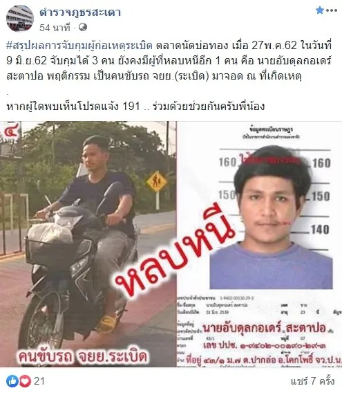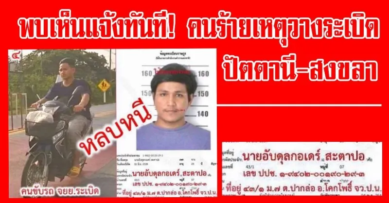 พบเห็นโปรดแจ้งเจ้าหน้าที่ทันที! เร่งไล่ล่าตัวคนร้าย หลังหลบหนีการจับกุม 1 ราย เหตุวางระเบิดตลาดนัดบ่อทอง หลังจากเกิดเหตุการณ์ คนร้ายลอบวางระเบิด ตลาดนัดบ่อทอง อ.หนองจิก จ.ปัตตานี เมื่อวันที่ 27 พ.ค.62 ที่ผ่านมา โดยคนร้ายอาศัยช่วงเวลาที่ประชาชนออกมาจับจ่ายซื้อหาอาหารเพื่อเตรียมละศีลอด วางระเบิด เป็นเหตุให้มีผู้เสียชีวิต จำนวน 2 ราย ทราบชื่อคือ ด.ช.อัยดิลฟิตลี ยะโก๊ะ อายุ 14 ปี และ นางสารีปะห์ อาเย๊าะแซ อายุ 35 ปี และมีผู้บาดเจ็บอีกจำนวน 22 ราย เป็นเจ้าหน้าที่ 4 ราย และประชาชนอีกจำนวน 18 ราย
