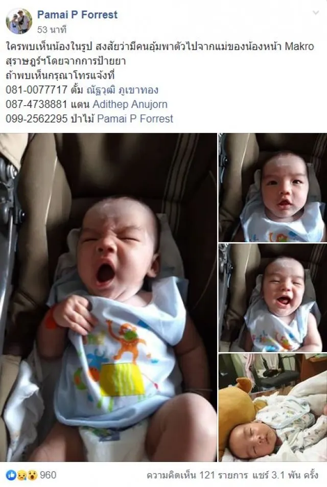 เรียกได้ว่าเป้นอีกหนึ่งเรื่องราวที่ชาวเน็ตแห่แชร์ และเข้ามาคอมเม้นท์กันเป็นจำนวนมาก เมื่อมีผู้ใช้เฟสบุ๊คชื่อ Pamai P Forrest โพสต์ในกลุ่ม สุราษฎร์ธานี แจ้งขอความช่วยเหลือเด็กทารกถูกลักพาตัวไปจากแม่ที่บริเวณหน้าห้างสรรพสินค้าในจ.สุราษฎร์ธานี พร้อมทั้งได้ระบุข้อความว่า..