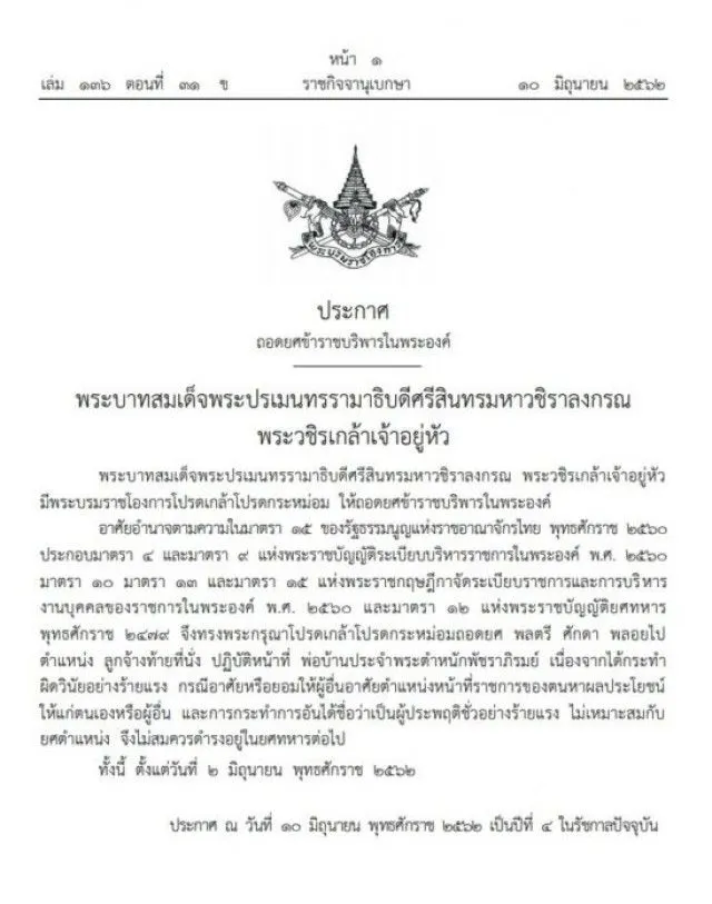 วันที่ 10 มิ.ย. ราชกิจจานุเบกษา เผยแพร่ พระบรมราชโองการ ประกาศ ถอดยศข้าราชบริพารในพระองค์ ความว่า
