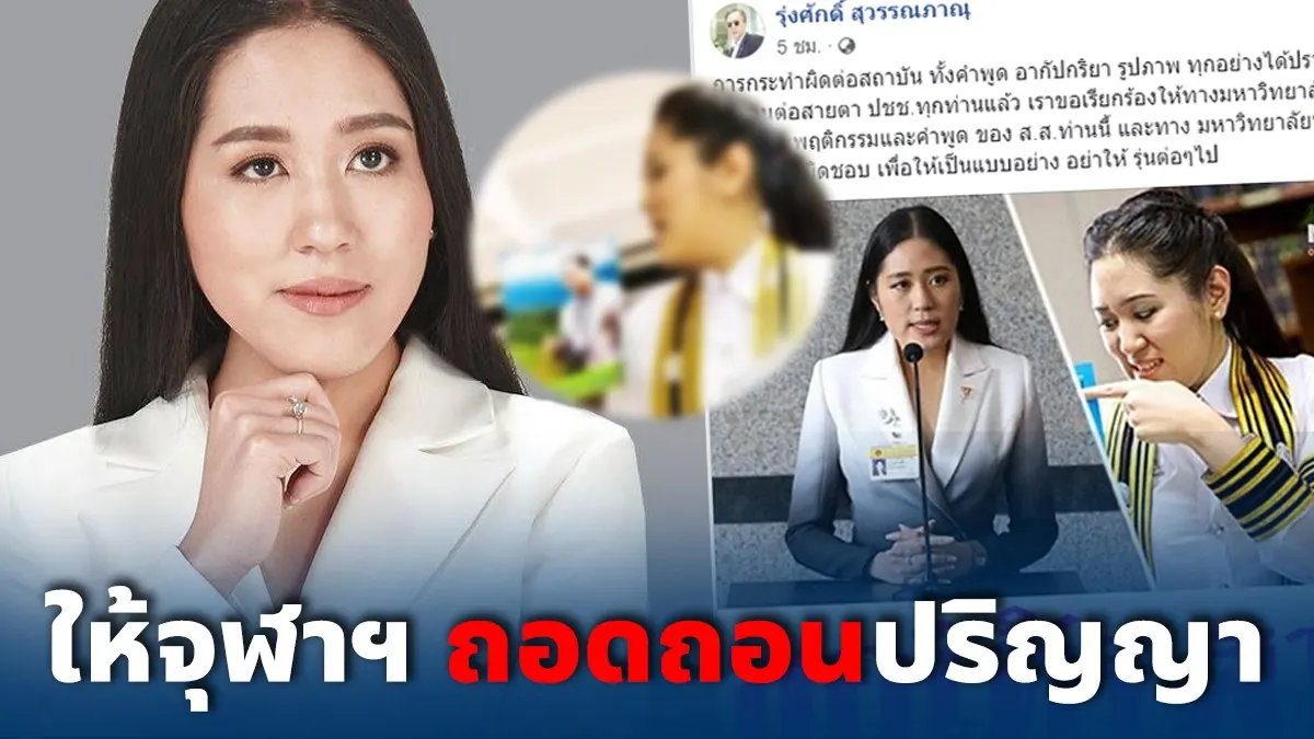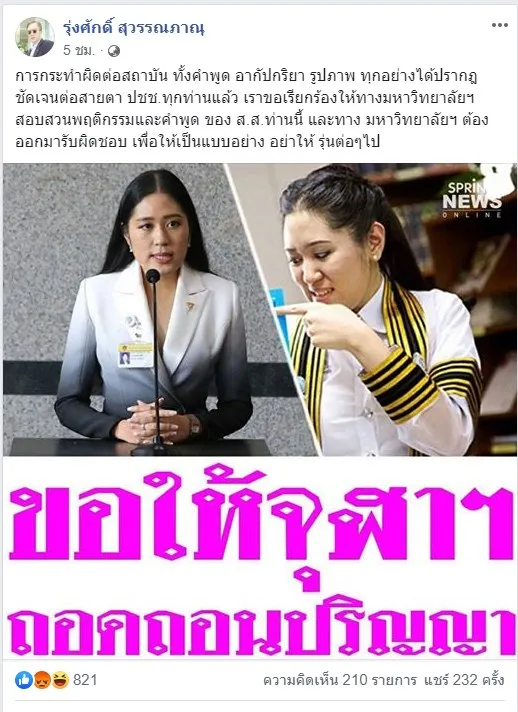 ซึ่งได้ระบุข้อความว่า “การกระทำผิดต่อสถาบัน ทั้งคำพูด อากัปกริยา รูปภาพ ทุกอย่างได้ปรากฎชัดเจนต่อสายตา ปชช.ทุกท่านแล้ว เราขอเรียกร้องให้ทางมหาวิทยาลัยฯสอบสวนพฤติกรรมและคำพูด ของ ส.ส.ท่านนี้ และทาง มหาวิทยาลัยฯ ต้องออกมารับผิดชอบ เพื่อให้เป็นแบบอย่าง อย่าให้ รุ่นต่อๆไป”