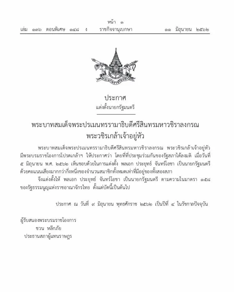 พระบาทสมเด็จพระปรเมนทรรามาธิบดีศรีสินทรมหาวชิราลงกรณ พระวชิรเกล้าเจ้าอยู่หัว มีพระบรมราชโองการโปรดเกล้าฯ ให้ประกาศว่า โดยที่ที่ประชุมร่วมกันของรัฐสภาได้ลงมติเมื่อวันที่ 5 มิถุนายน 2562 เห็นชอบด้วยในการแต่งตั้ง พล.อ. ประยุทธ์ จันทร์โอชา เป็นนายกรัฐมนตรี ด้วยคะแนนเสียงมากกว่ากึ่งหนึ่งของสมาชิกที่ทั้งหมดมีอยู่ทั้งสองสภา จึงแต่งตั้งให้ พล.อ. ประยุทธ์ จันทร์โอชา เป็นนายกรัฐมนตรี ตามความในมาตรา 158 ของรัฐธรรมนูญแห่งราชอาณาจักรไทย ตั้งแต่บัดนี้เป็นต้นไป