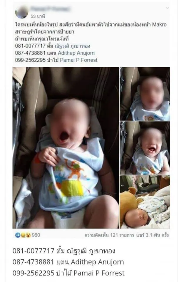 จากกรณีนางสาวศศิธร ชูจิต อายุ 30 ปี (เสื้อดำ) ชาวบ้านหมู่ที่ 6 ตำบลตาเนอะแมเลอะ อำเภอเบตง จังหวัดยะลา ได้แจ้งความต่อพนักงานสอบสวน สภ.เมืองสุราษฎร์ธานี ว่าลูกชายวัย 1 เดือน 8 วัน ถูกคนร้ายเป็นหญิงรูปร่างท้วมมาป้ายยาตนเอง ทำให้ตนสลึมสลือควบคุมตัวเองไม่ได้และได้อุ้มลูกชายตนหายไป เจ้าหน้าที่ได้ระดมกำลังกว่า 40 นาย เร่งติดตามและคลี่คลายคดีอย่างเต็มที่