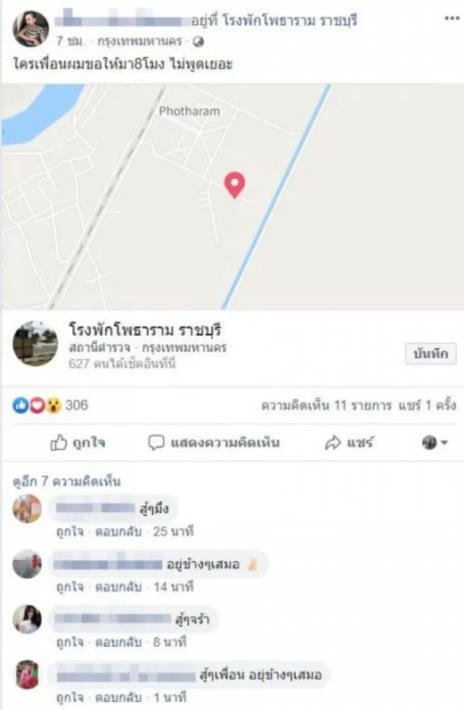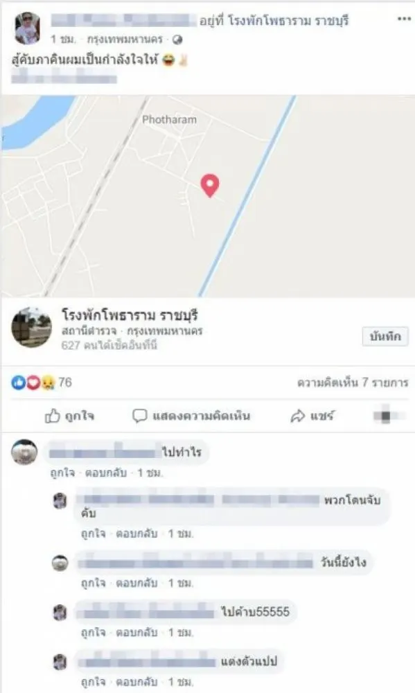 และเช็คอินโรงพักโพธาราม พร้อมข้อความว่า “ใครเพื่อนผมขอให้มา8โมง ไม่พูดเยอะ”